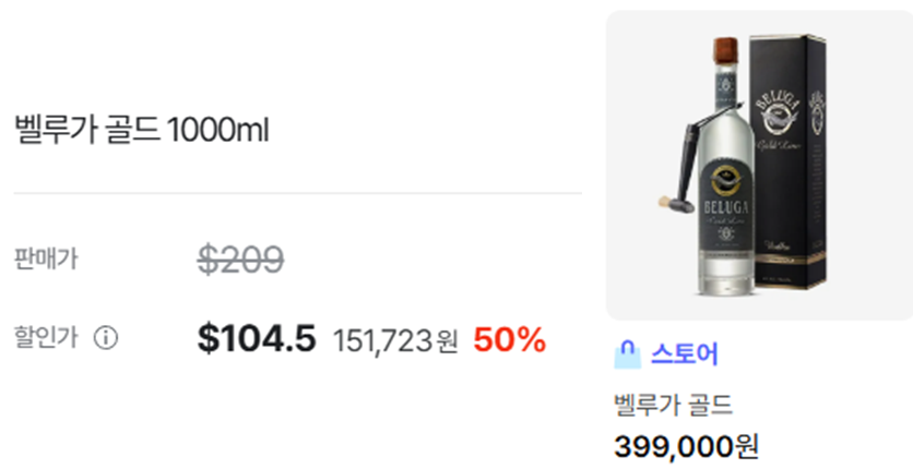 면세점 가격은 $104.5로 신세계와 신라면세점이 동일합니다. 시중에서는 40만 원에 구입이 가능합니다. 면세점 가격과 시중 가격의 차이가 높은 보드카입니다.